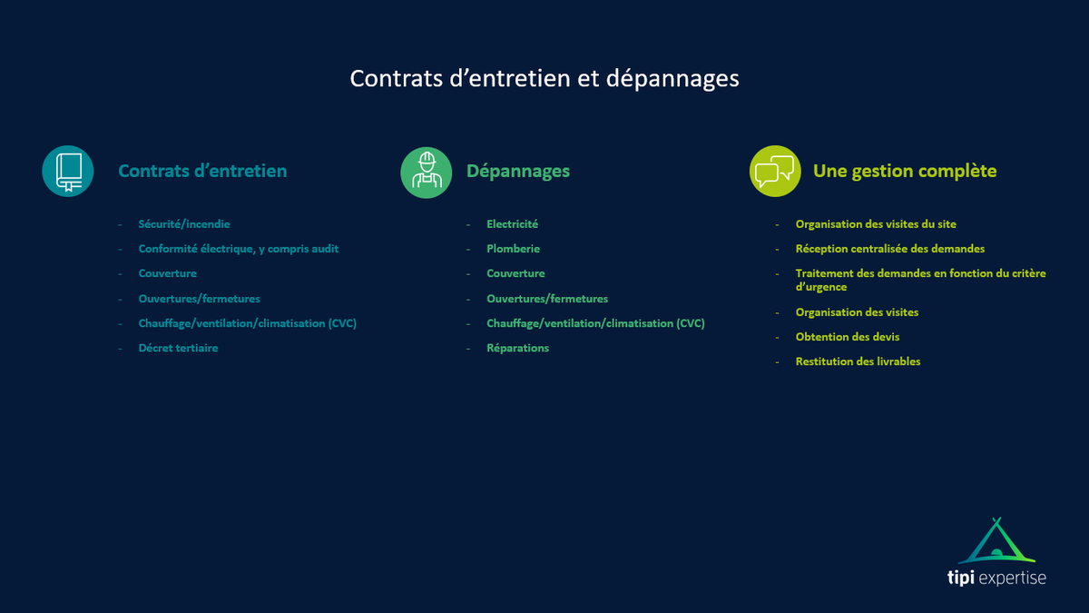 Nous proposons de définir ensemble pour quels corps d'état un contrat d'entretien est nécessaire/obligatoire en fonction du site. Une équipe d'entreprises fiables et spécialisées est mise en place pour les gérer, ainsi que le passage d'un auditeur et les dépannages tout au long de l'année.